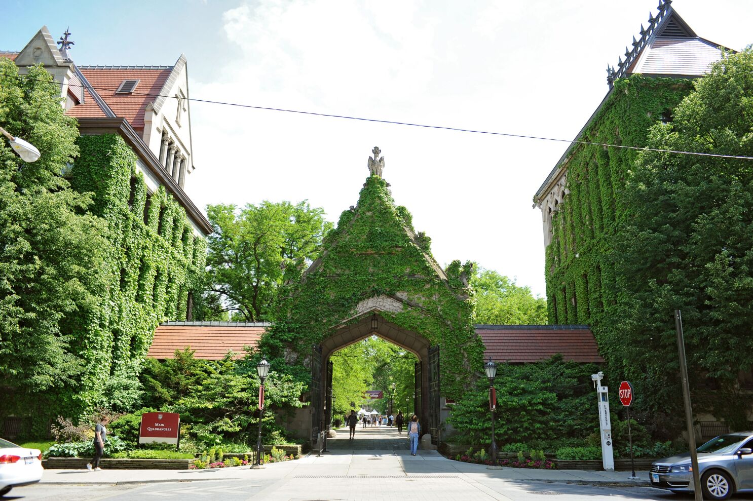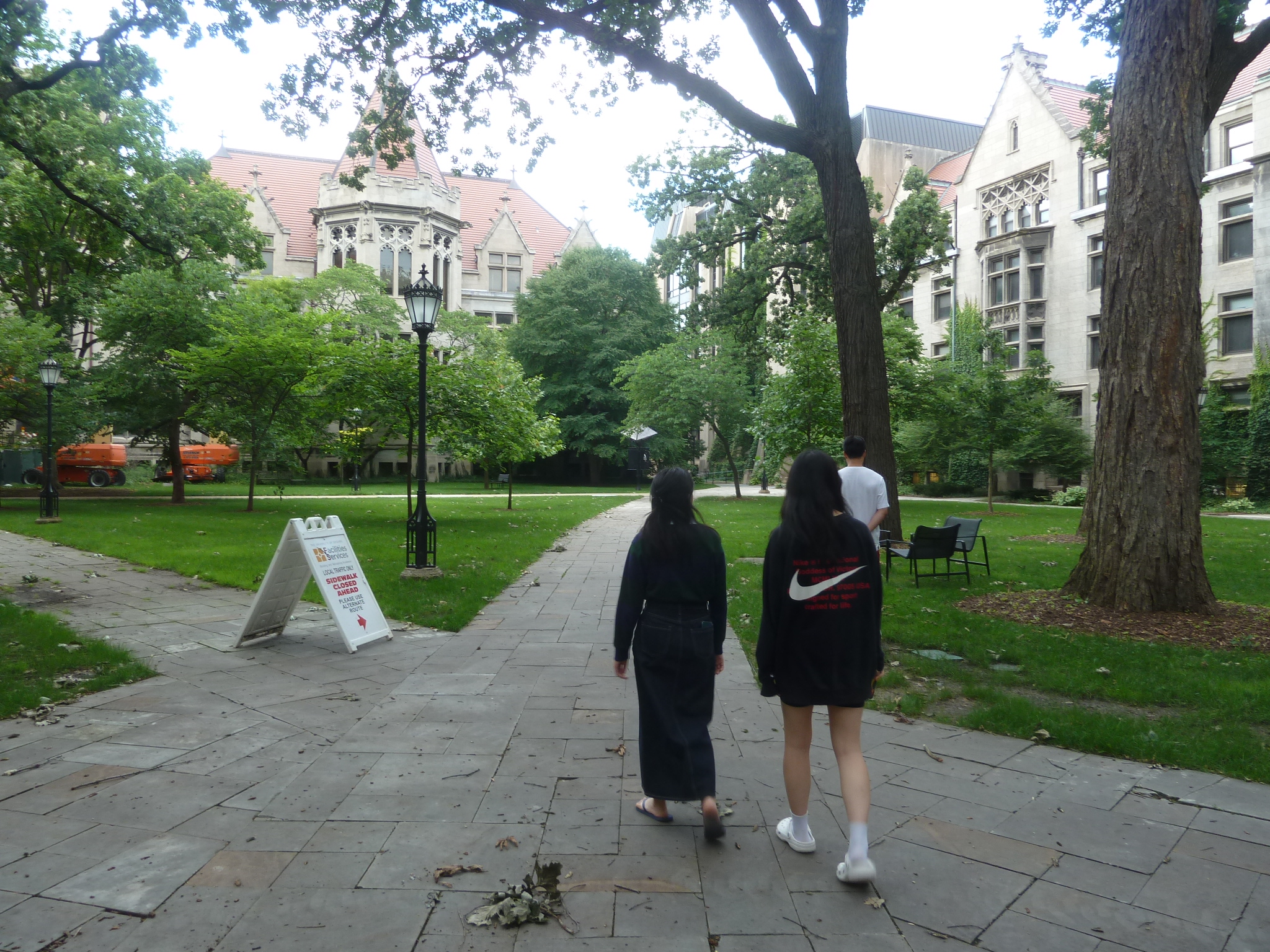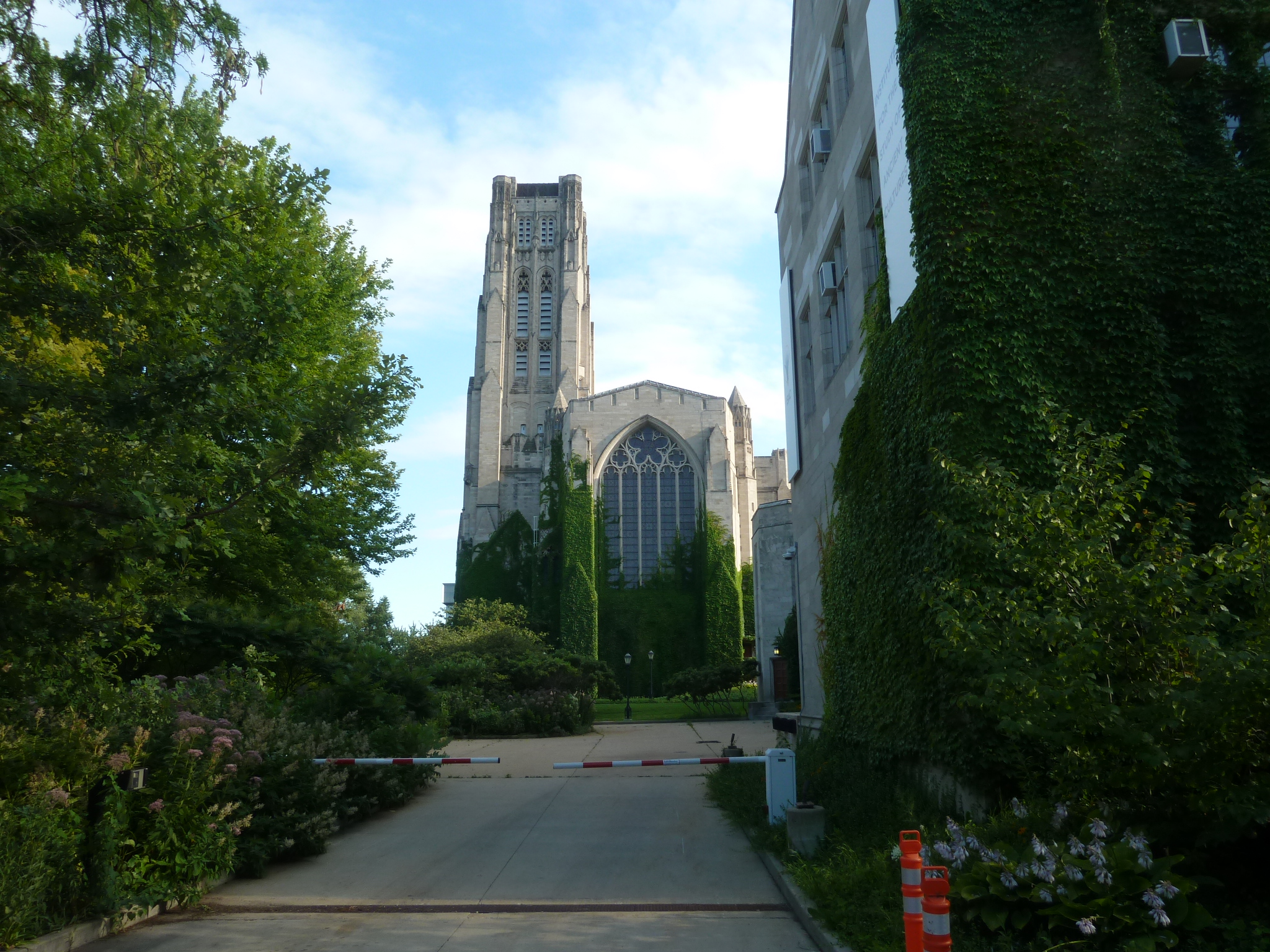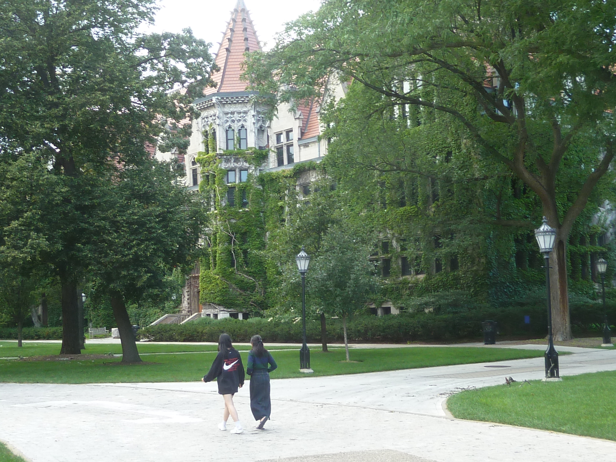 맞은편으로 Booth School of Business 그리고 Rockefeller Memorial Chapel
