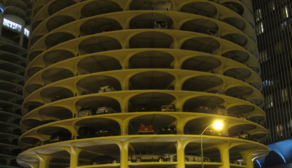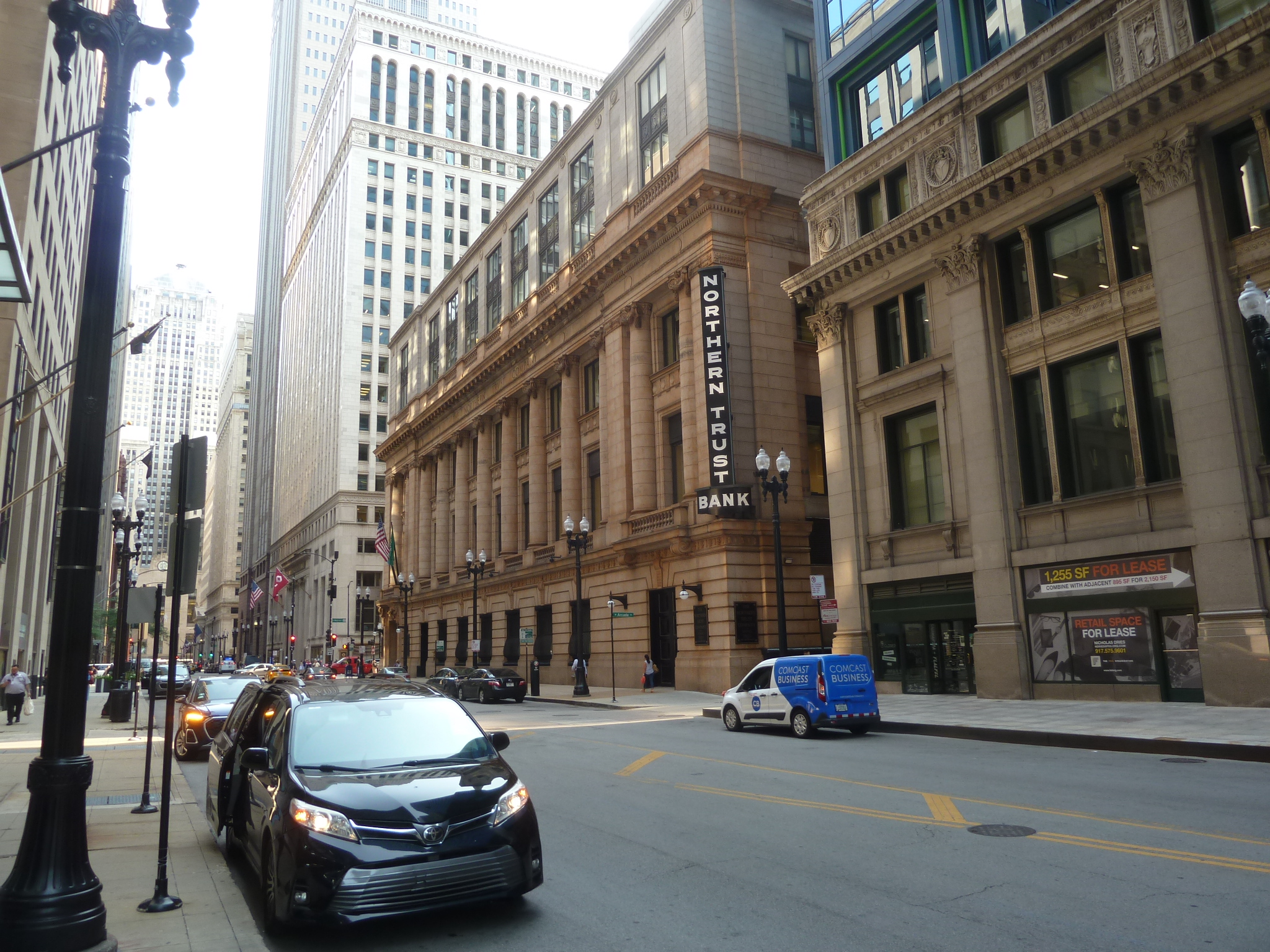 Bank of America 가 보이는 독특한 금속기둥 건물, 110 North Wacker building