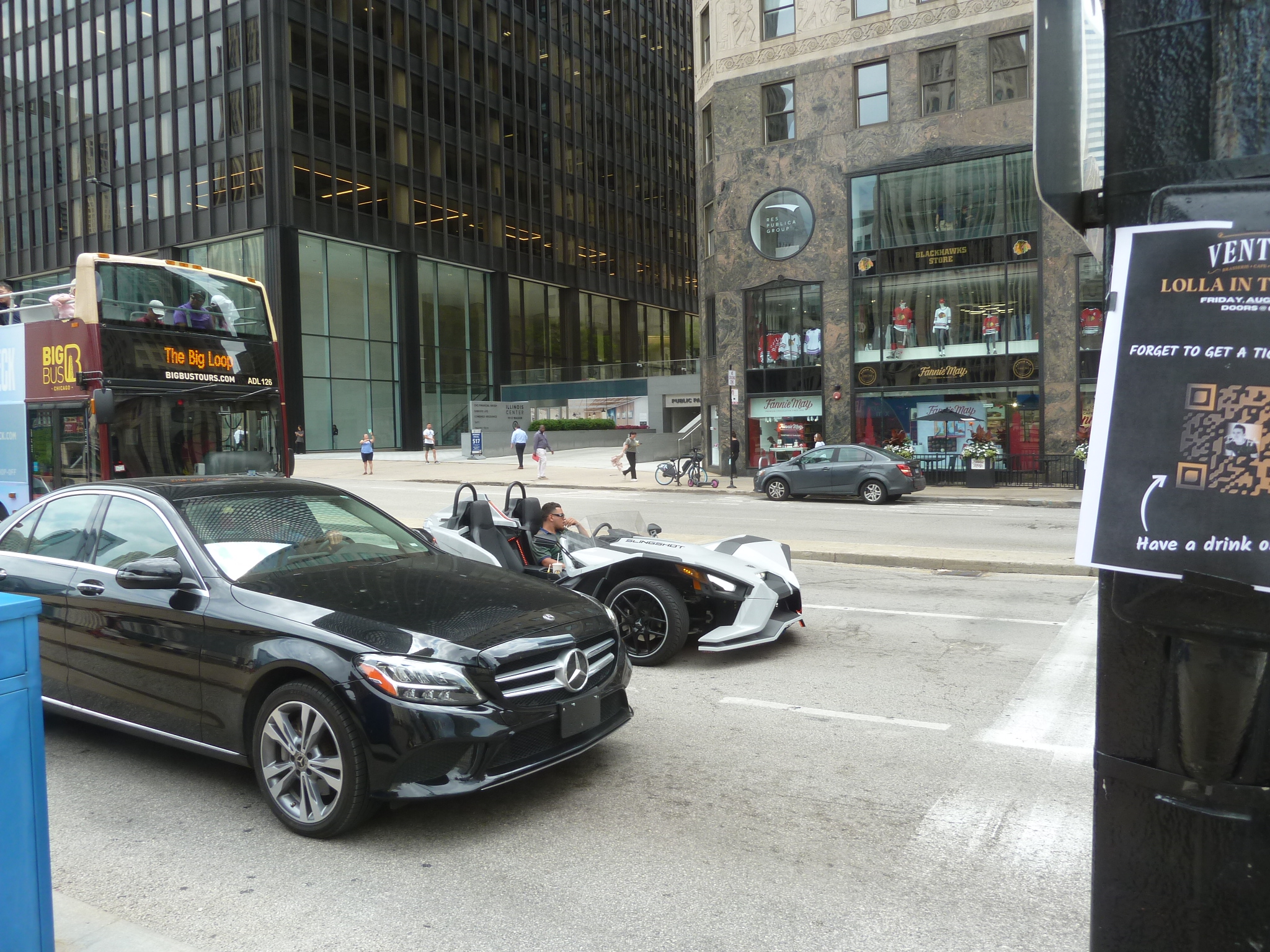 신호대기중인 오픈카 같이,  여기서는 삼륜(Three Wheel) 차가 자주 보이는데
